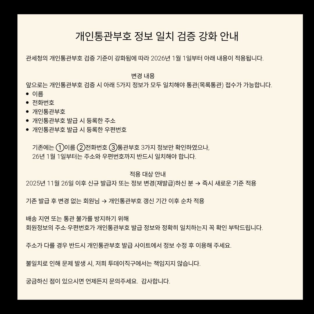[안내] 개인통관부호 정보 일치 검증 강화 안내